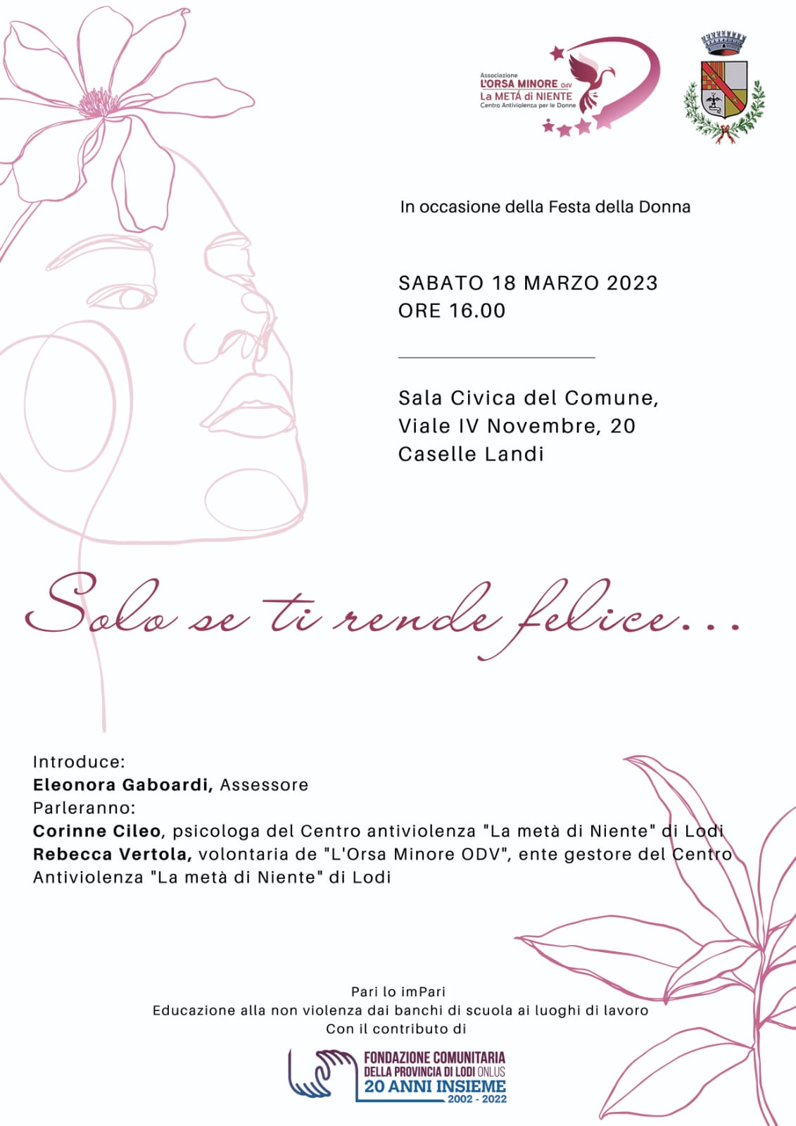 L’Amministrazione comunale, da sempre attenta al tema della violenza di genere, invita tutta la cittadinanza il 18 marzo alle ore 16.00 all’iniziativa proposta dal centro anti violenza di Lodi. Questa iniziativa pur essendo nel mese di marzo avviene in un momento in cui i “riflettori” sono già spenti, ciò per affermare che questo tema va trattato sempre e deve riguardare la nostra quotidianità se vogliamo giungere finalmente alla parità di genere.