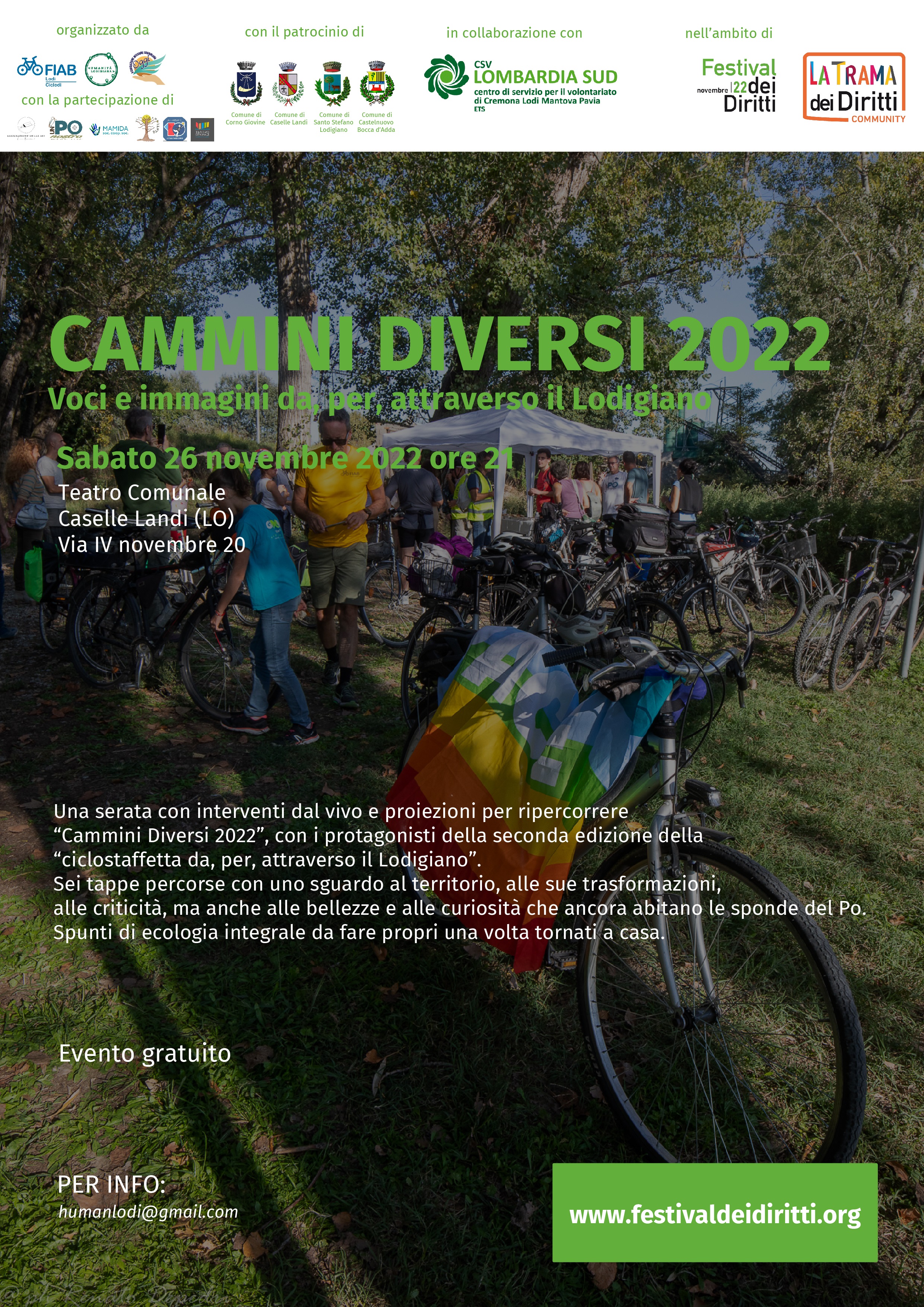 Quest’anno anche Rete Umanità Lodigiana partecipa al Festival dei Diritti 2022 dedicato al tema COSTRUIRE SPERANZA, con l’iniziativa Cammini Diversi 2022. Voci e immagini da, per, attraverso il Lodigiano. L'evento si terrà il 26 Novembre 2022 alle ore 21.00 presso il Teatro Comunale di Caselle Landi in via IV Novembre n. 20.