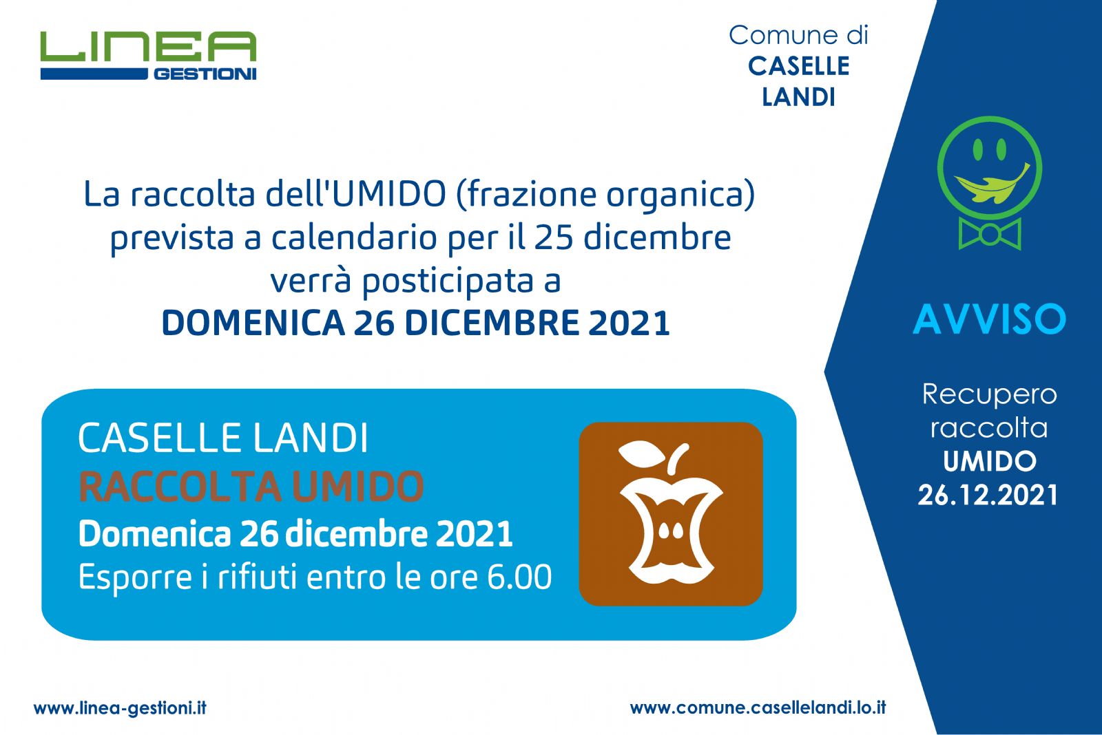 Con la presente vi comunichiamo che la raccolta dell’umido, prevista per sabato 25 dicembre e stabilita nel calendario 2021 dal precedente gestore non potrà, per motivi organizzativi, essere svolta.