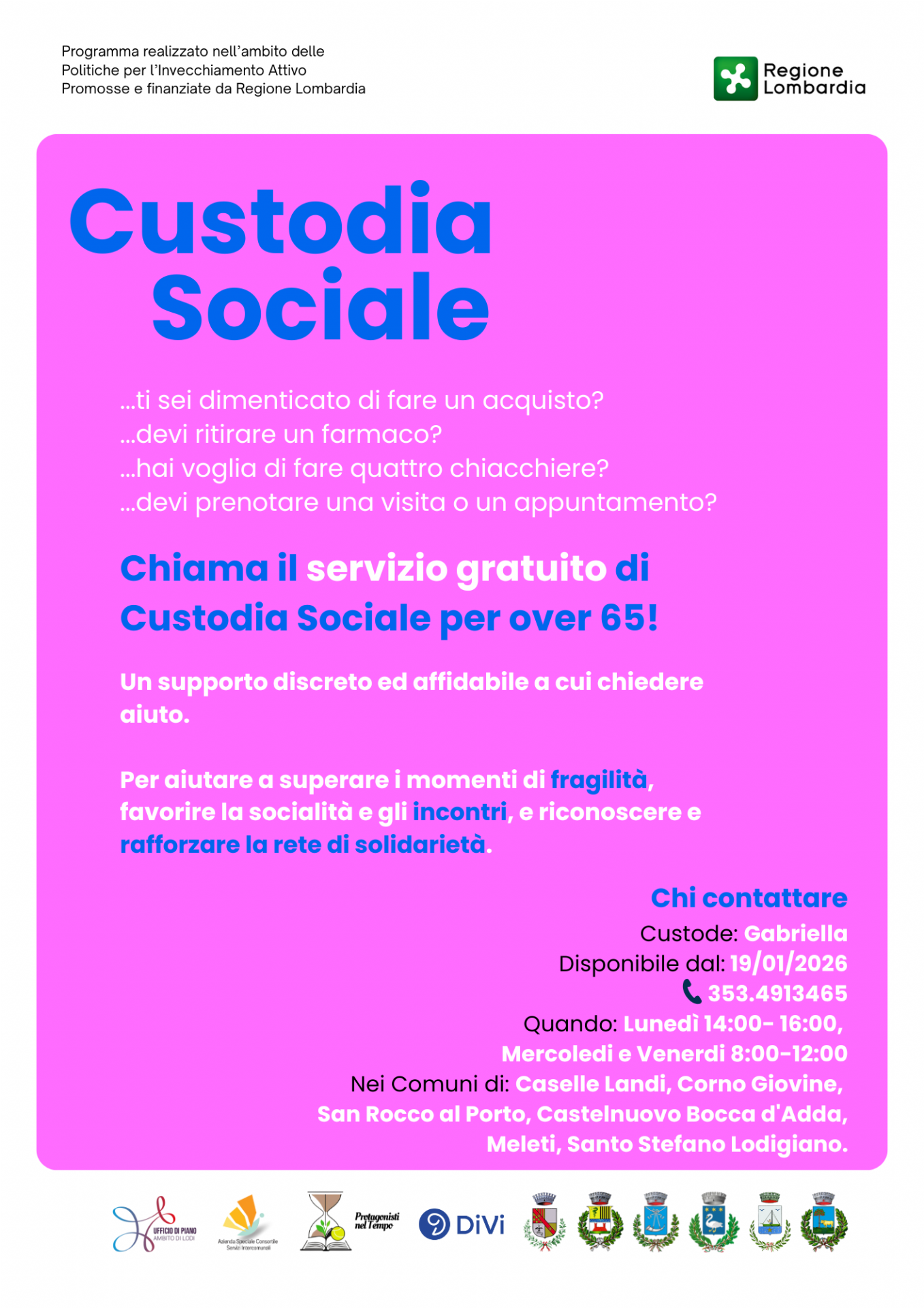 La locandina illustra il progetto sperimentale denominato "Custodia Sociale" al via sul territorio a partire dal 19.01.2026
